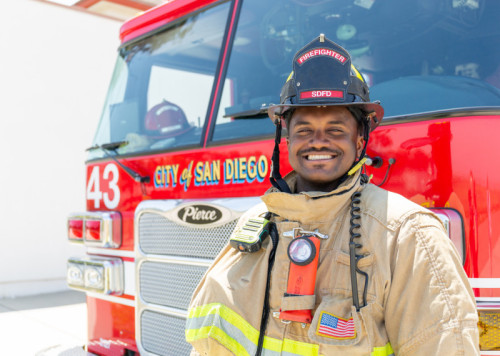 - Firefighting Proves to Be ‘Hand-in-Glove Fit’ for GraduateDwaine Collier always has thought of himself as a guy who runs toward the frightening things that most people run away from. As a boy, his career aspiration was to be on a SWAT team. As a student at Cal State San Marcos, though his academic track early on was kinesiology, he gravitated to the theater and began auditioning for every high-pressure stage role possible. So when Collier was at a crossroads in his post-graduate life and his stepfather figure suggested that he explore firefighting, perhaps the most surprising aspect is that Collier had never thought of it himself. Who, after all, is more willing to charge headlong into a risky situation than a firefighter? “I’m the person who will stop their car on the side of a busy road to help somebody rather than driving on,” Collier said. “That’s just what I do. It’s what’s in me. So for me, this job is a hand-in-glove fit.” Collier was speaking from a common area inside San Diego Fire Station 43, which is in Otay Mesa and has been his home away from home for the past year. On this day in late April, he had donned his gear several times to go on calls in the station’s primary engine with his firehouse colleagues – a firefighter paramedic, an engineer and a captain. The calls were fairly routine. Because Station 43 is in a lightly developed neighborhood only a few miles north of the Mexico border, most of the emergencies that its crews respond to are vegetation fires, car fires and incidents at the border itself – often people sustaining injuries as they try to cross into California illegally. Collier, 29, is less than four years into his firefighting career, which translates into this current assignment far from the heart of San Diego. He has to gradually work his way up the ranks and into more plum stations. But Collier still loves where he is and what he’s doing. He gladly will show off for visitors every nook and cranny of Station 43 – from the exercise space where he gets to incorporate one of his favorite activities (weightlifting) into his work hours, to the kitchen where he frequently cooks meals for the whole house, to the cherry-red fire engine that he has come to know every inch of like the back of his hand. “Becoming a firefighter is one of the best decisions I’ve ever made,” he said. “It’s not an easy job. When the stuff hits the fan, it sprays everywhere. But it’s also one of the most rewarding things you can do.” It was at CSUSM that Collier discovered the stability and self-confidence that made life as a firefighter seem realistic. He grew up in the foster system and entered the university having attended an astounding 17 different schools before he even reached high school, Olympian in Chula Vista. He arrived at CSUSM with the assistance of ACE Scholars Services, the university’s program for former foster youth. Collier switched his major from kinesiology to visual performing arts and threw himself into theater with abandon, ultimately starring in seven shows during his five years as a student. “What CSUSM gave me is the belief that I can do anything,” said Collier, who graduated in 2018. “I came into college with extreme educational deficiencies. Yet CSUSM had every tool to catch me up and help me succeed. It gave me the environment to grow.” Collier intended to pursue a Master of Fine Arts and a doctorate en route to becoming a theater professor, but he admits that he didn’t prepare well enough for his graduate school auditions and was delivered a harsh “reality check.” He was teaching kids at Callan Swim School when his stepdad proposed what turned out to be a fateful visit to the Heartland Fire & Rescue station in El Cajon. He was a reserve firefighter there for a year before entering the San Diego Fire Academy in 2022. Now Collier aims to keep climbing the ladder – both literally and figuratively – as a firefighter while not pulling it up behind him. As soon as he joined the fire service, he got involved with community outreach as part of the team tasked with recruiting the next generation of firefighters. And his next goal is to take classes toward becoming an instructor of young firefighters eager to enter the fire service. “I feel like that’s my next calling,” he said. “I’m trying to figure out how to give back by motivating and helping others. It gives me joy to see people be uplifted and accomplish things.” Media Contact Brian Hiro, Communications Specialist bhiro@csusm.edu | Office: 760-750-7306